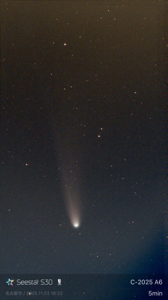 さすがに名古屋市内だけあってバックが明るくて尾はそれほど長くは見えませんが、姿は十分に彗星です。そして核がキラッと光っているのが見えます! なんとも美しい!!