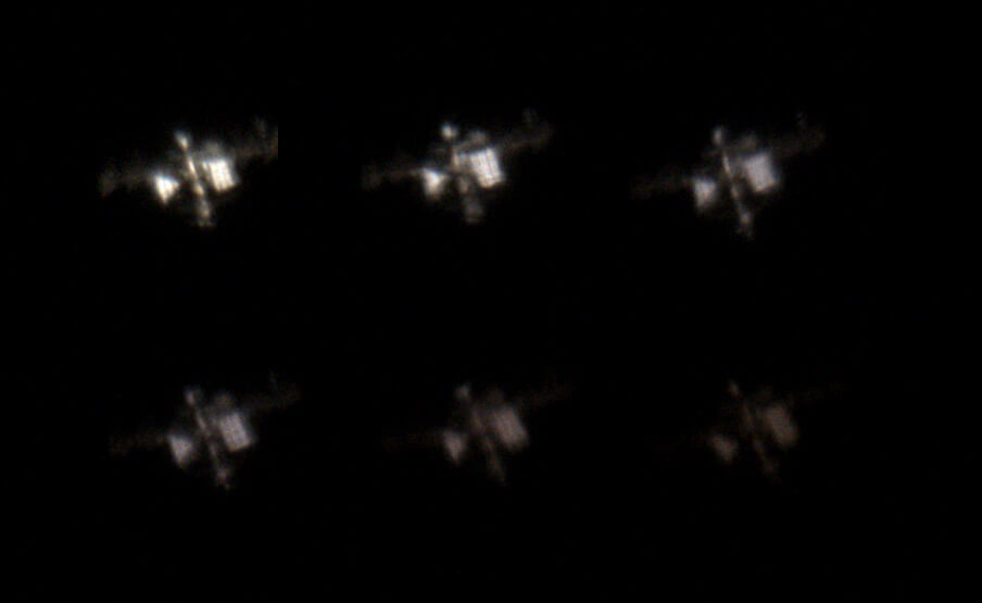 北極星がメチャクチャに暴れていてすこぶるシーイングの悪さ! これではとてもISSの細部が写ってくるとは思えないので、地球の影に入るところをメインに捉えてみます。 であればワイドレンズでその光跡も記録しておきましょう。EOS6Dに16㎜、ISO800で2秒露光で連写します。