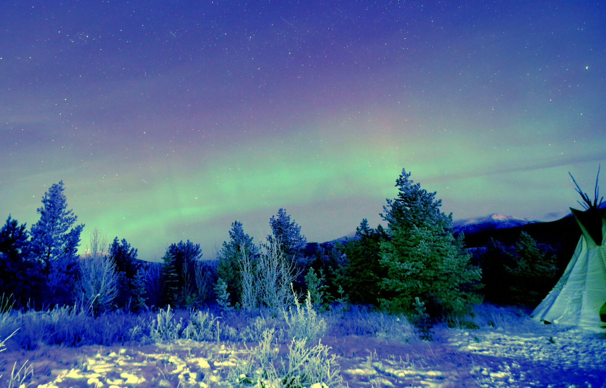 ティピーの上には北斗七星が見えていますが、そのあたりではカーテンのようになびくオーロラが見えていたようです。 地面まで緑色に染まっています。
