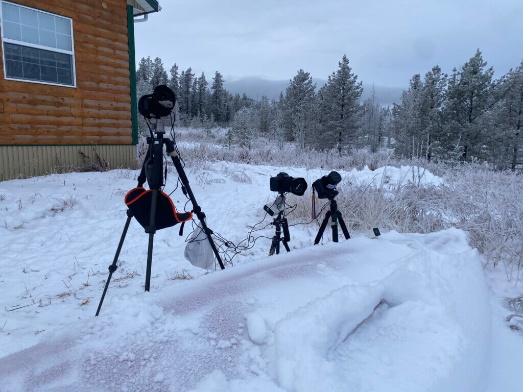 α7sとEOS80Dの2台とATOMcamでオーロラを待ちます。ただし空は曇ったままですが、カペラと木星が薄くかろうじて見えている。