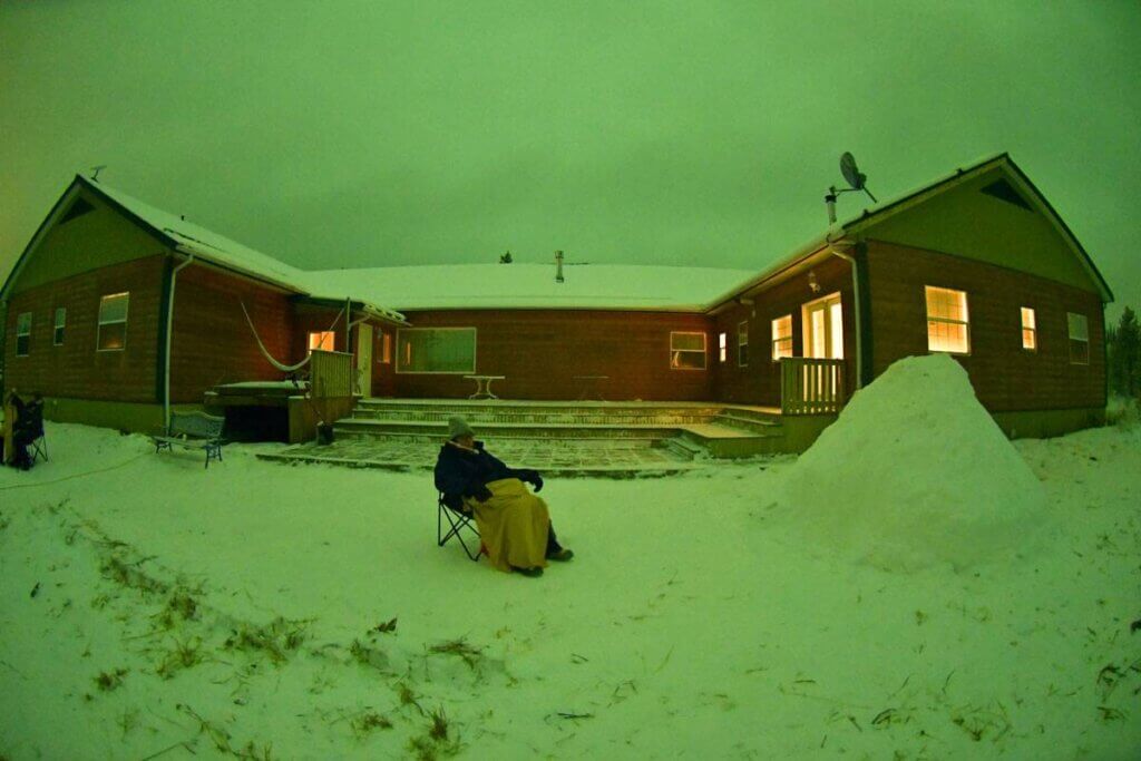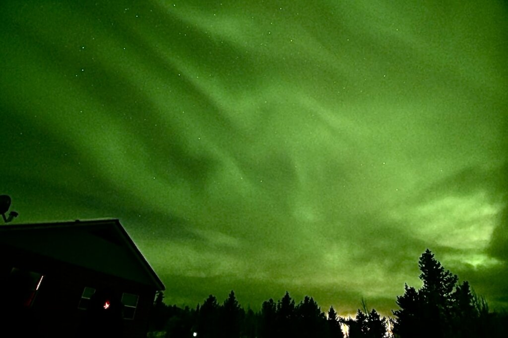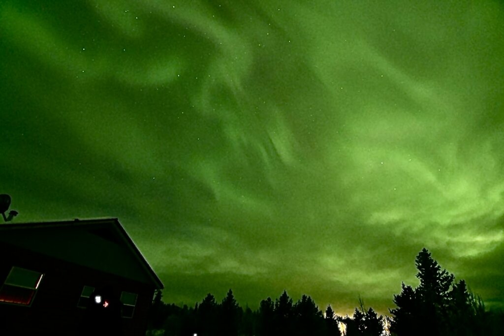 この日も暗くなってから曇り空を撮影すると空全体の雲が緑色に写りました。やはり空のどこかで強く光るオーロラが出ているに違いない。