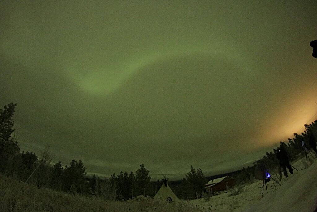 西から天頂を通って東へ1本の線が天の川のように光って見えている。「え!動いている!」明らかに雲が流れていく動きではない! 白い竜がうねっているような~! オーロラだ!!しかも空を北と南に分断するように出ている! こんな厚い雲を通して見えるなんて凄いぞ!!