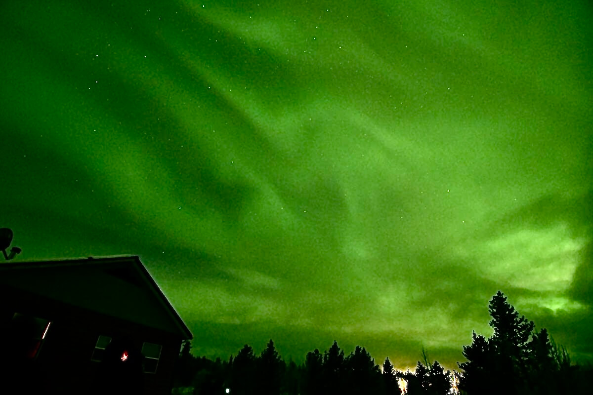 この日も暗くなってから曇り空を撮影すると空全体の雲が緑色に写りました。やはり空のどこかで強く光るオーロラが出ているに違いない。