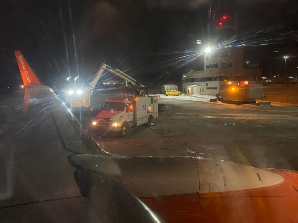 さて無事に飛行機へ搭乗、席に着くとゴンドラに乗った人が翼についた氷を調べているようです。