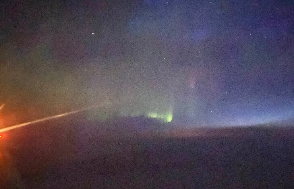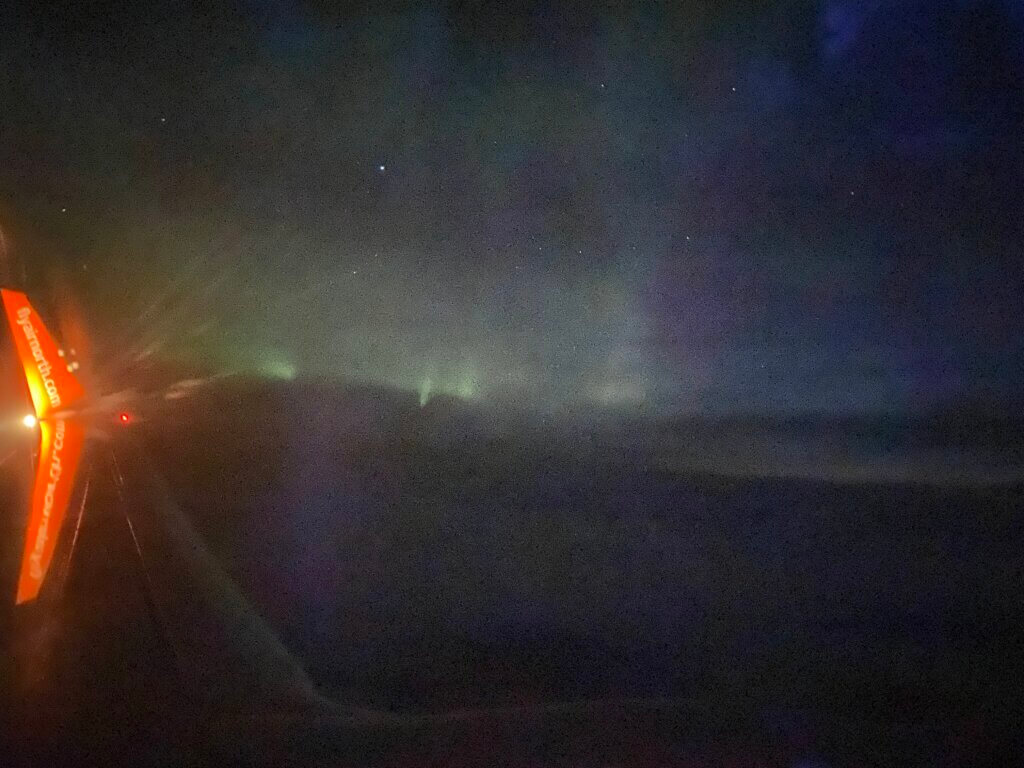 定刻通りに飛び立ち、雪を降らせている厚い雲を通り抜けるとすぐに、見えた!オーロラ!!間に合った!!!