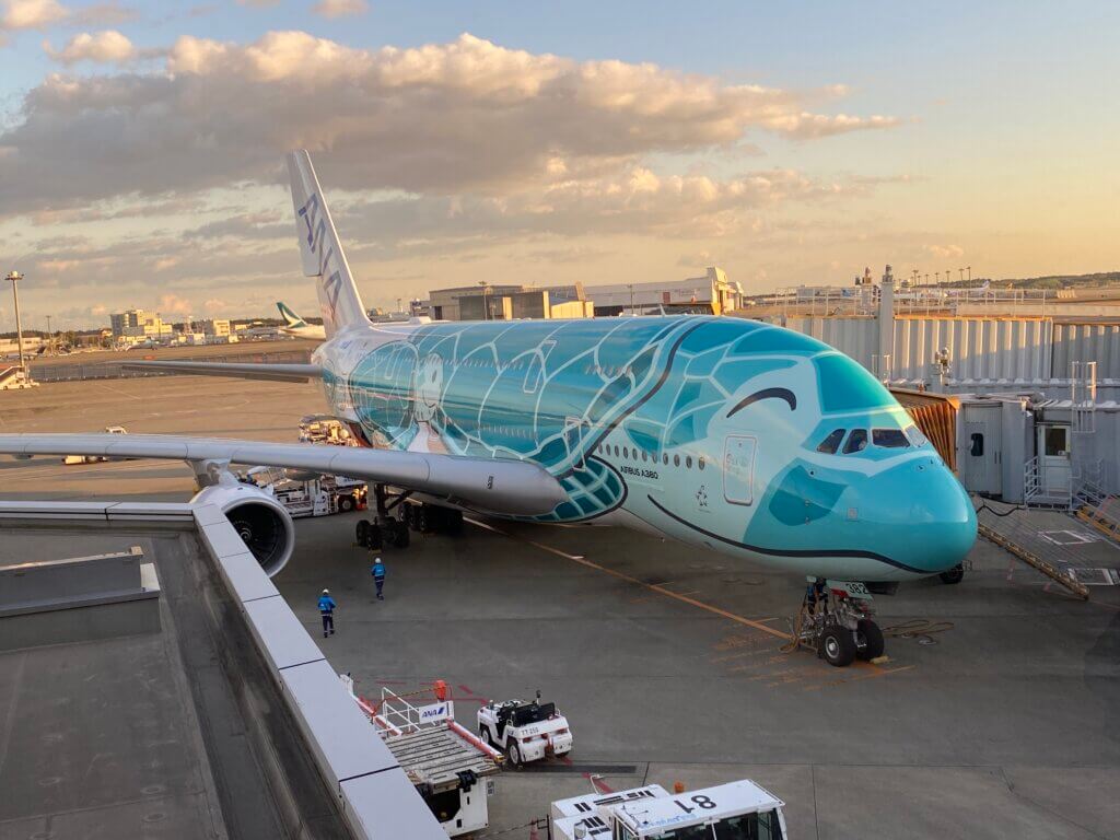 近くにこんな飛行機もいました、ハワイとかグアムの便でしょうか。
