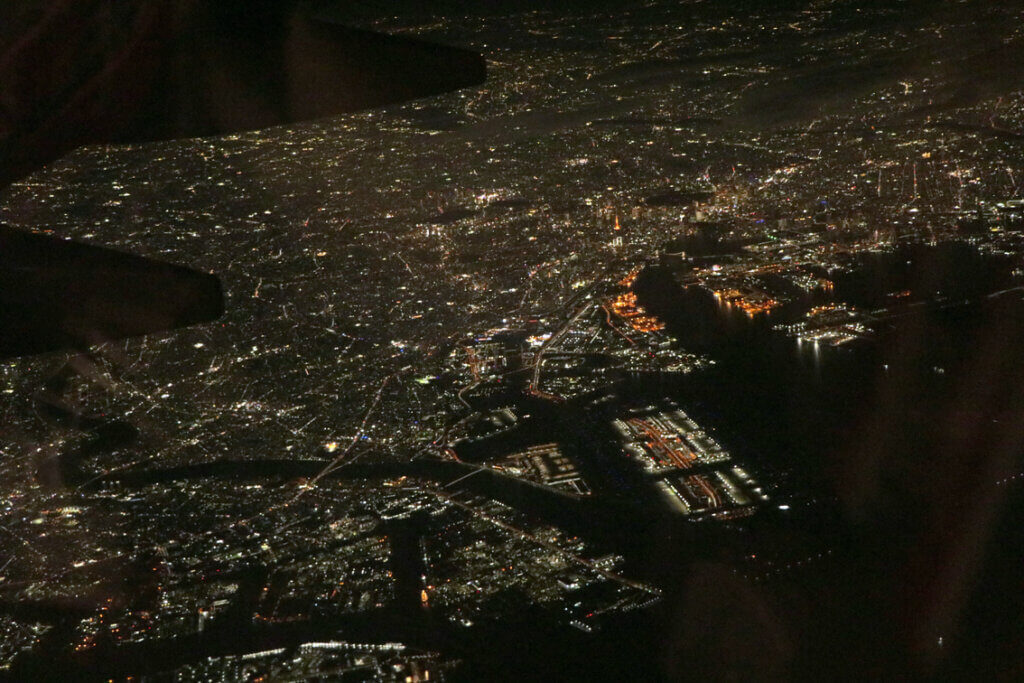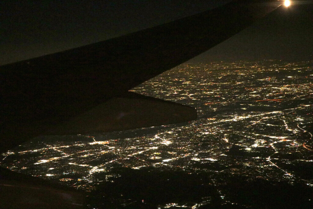 大急ぎで一眼レフをバッグから取り出し、忍者レフを装着してシャッターを押す。しかしシャッターが切れない!機内が暗くてモードのダイヤルがどこになっているのか見えないし、レンズのフォーカススイッチも見えず、諦めてiPhoneで撮りながら眺めよう!