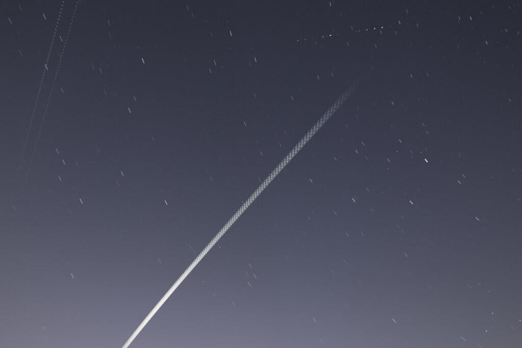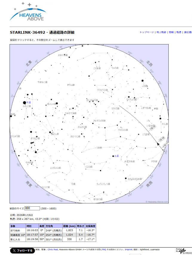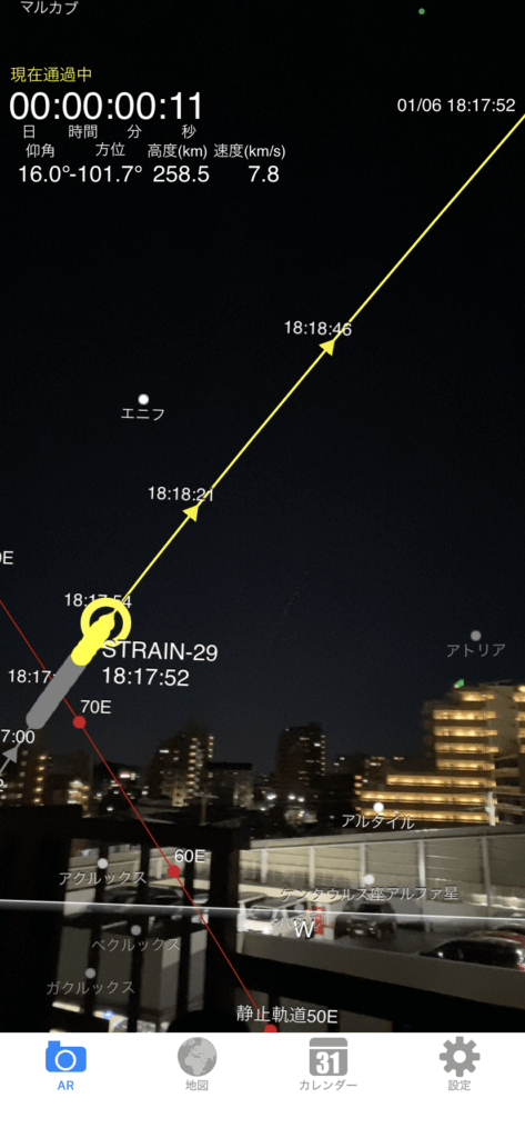 翌1月6日の通過予報は18時18分、打ち上げから2日で銀河鉄道の長さは193.5㎞になっているようです。3倍近く長くなっているので、ソニーα7sには30㎜(APS-C) F1.4にして暗くなっているかもしれないのでISO20,000、30FPSで動画撮影をします。