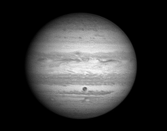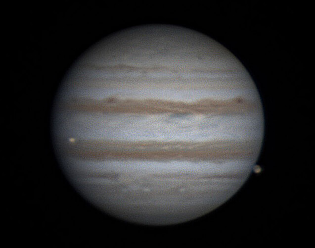 23時03分 ガニメデはより木星から離れましたが、ガニメデの影が木星面に見えてきました。イオの影と比べても大きいのがよくわかります。