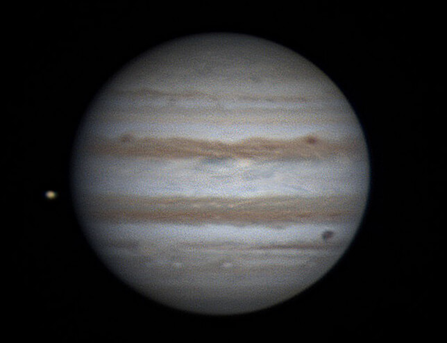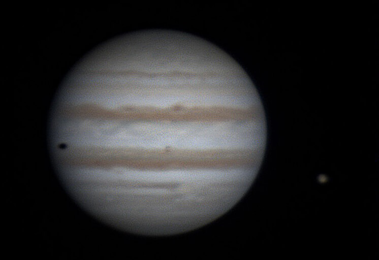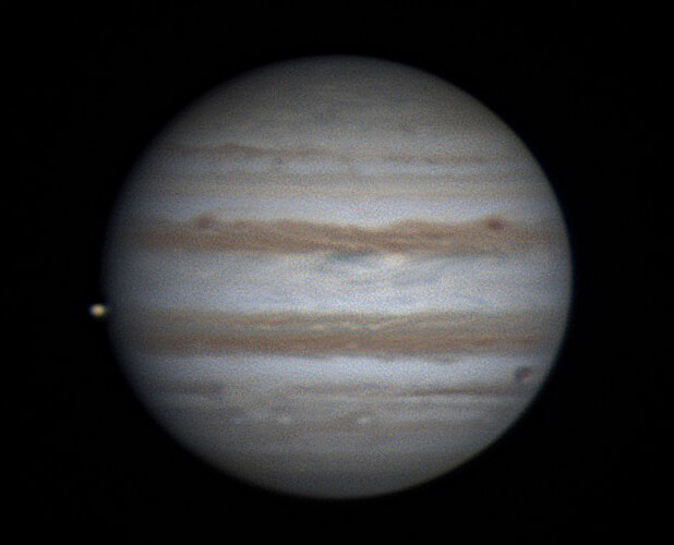 22時37分 イオが木星面中央くらいにきれいな球に見えています。そして左の方からイオの影が見えてきました。