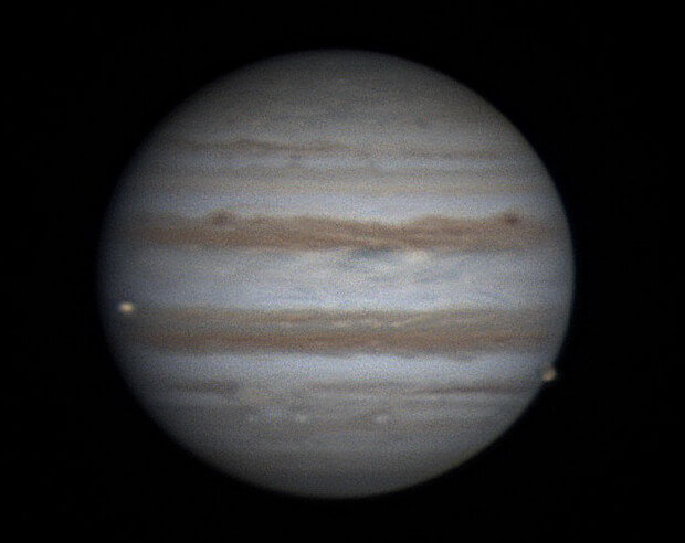 21時26分 イオが木星面に入り、ガニメデが木星面から出る直前で、2つの衛星が木星面にあります。
