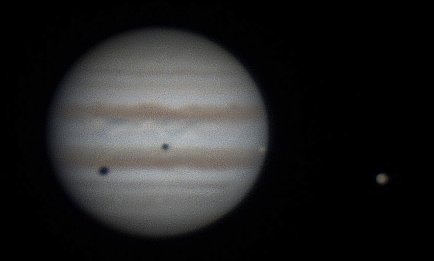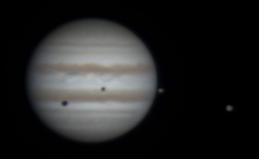 気流が悪く木星面がはっきり見えないのが残念ですが、イオとその影、ガニメデとその影があって位置関係を考えると、右の方に太陽があって木星の周りを衛星の軌道がなんとなく立体的に想像できそうですね。